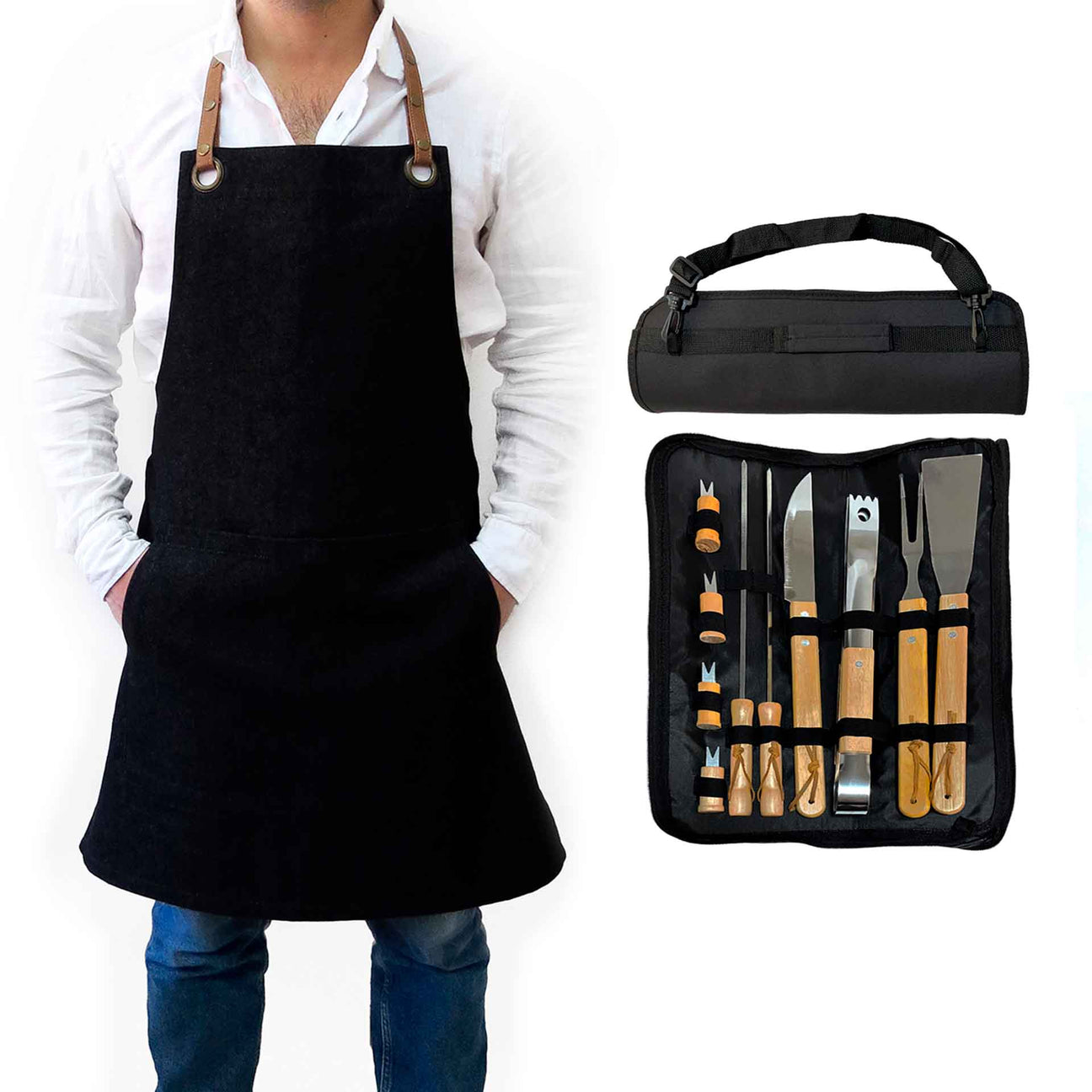 Pack Set Asado Parrilla 10 unds + Pechera Jeans Negra con tirantes cuero sintético Unisex